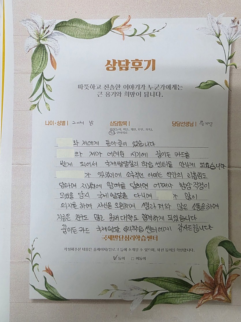 상담후기 페이지 정보 작성자국제발달 댓글 0건 조회 80회 작성일 26-01-08 21:04 본문 9년을 함께 해 온 졸업생입니다. 목록 답변 이전글상담후기 26.01.08 댓글목록 댓글목록 등록된 댓글이 없습니다.
